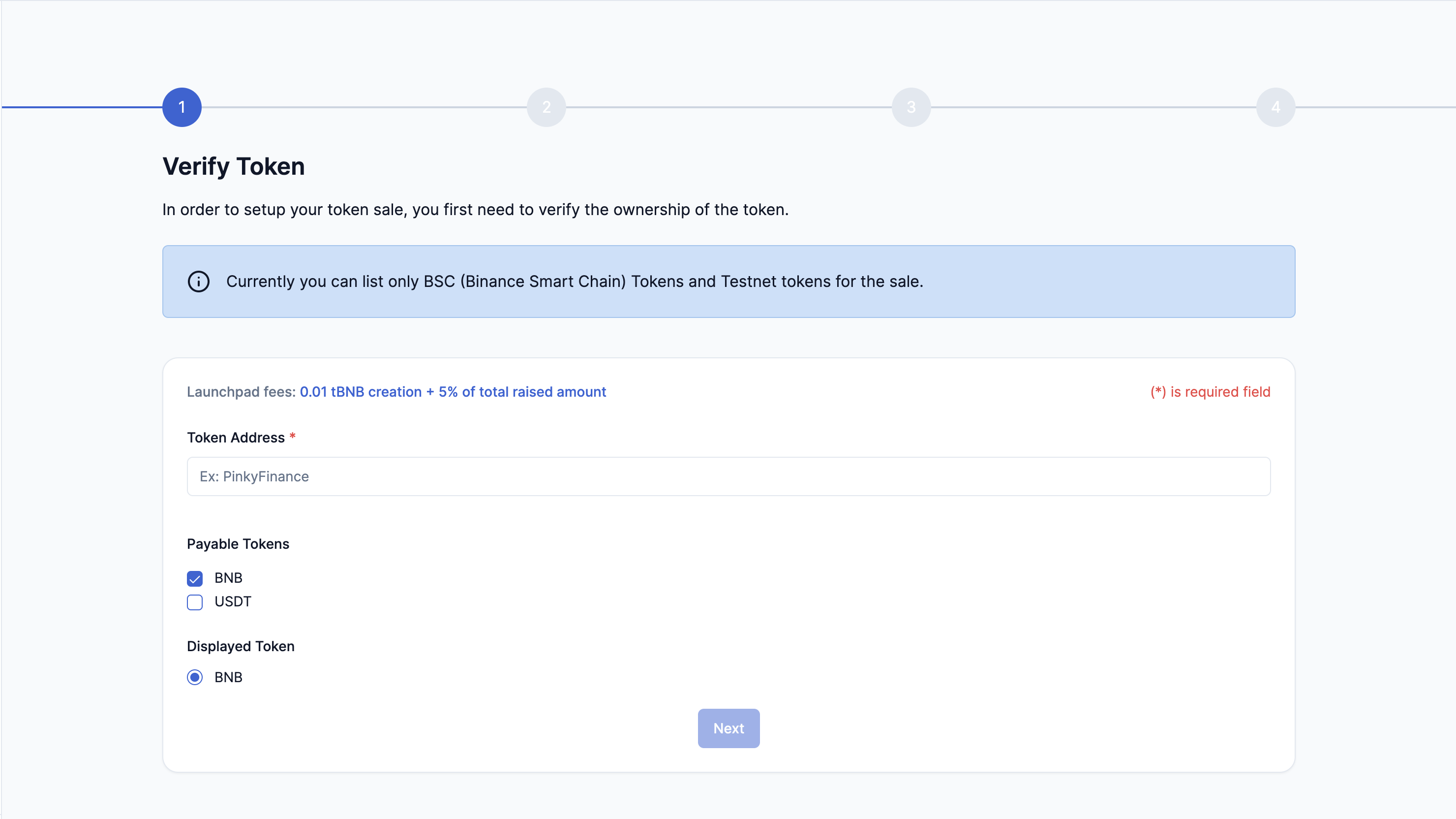 To list your token for sale, you must possess a token on the BSC chain and ensure that your connected wallet holds the necessary balance for the sale. For instance, if you intend to add 100,000 tokens, you should have this quantity available in the wallet from which you plan to initiate the sale.