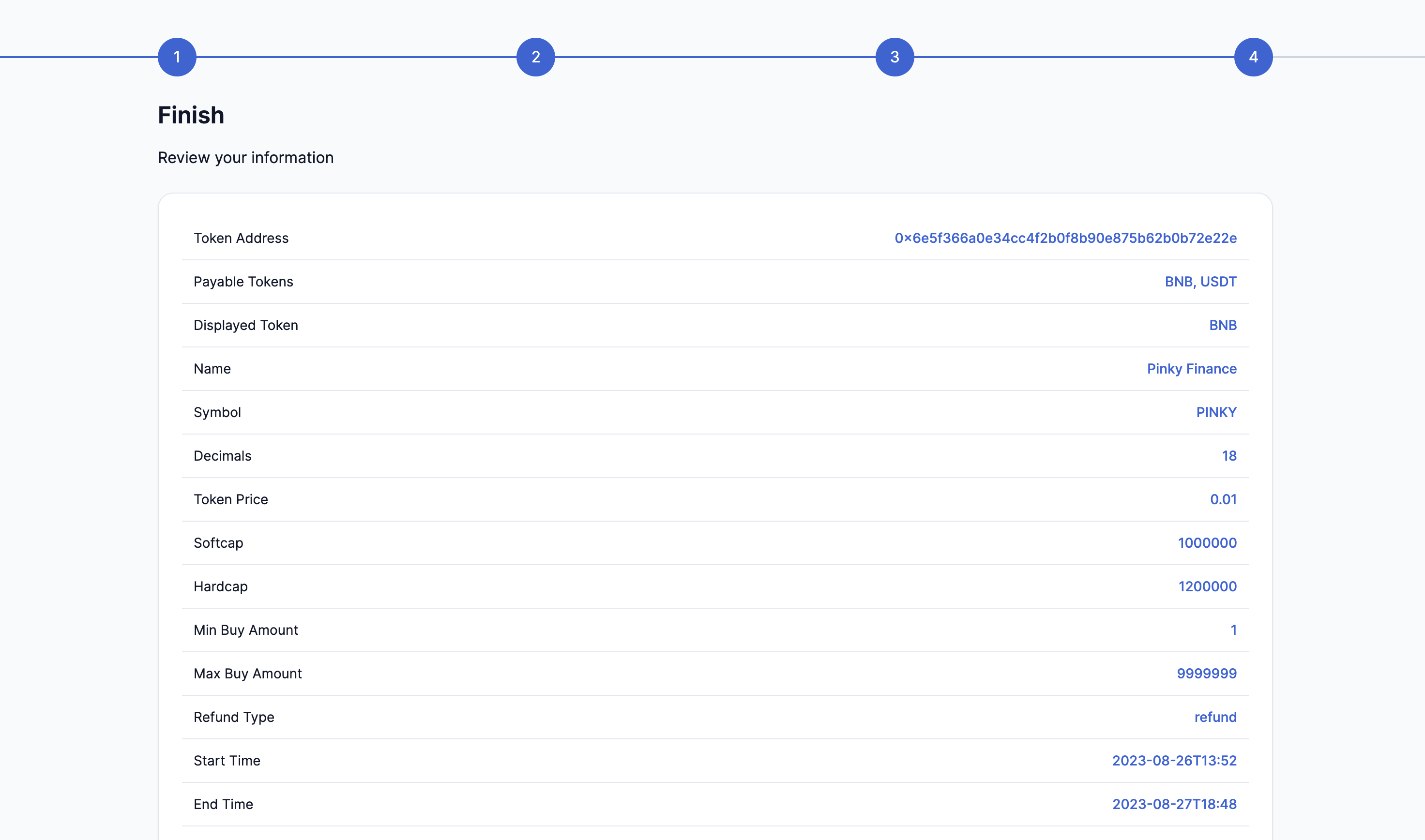 If there were any issues while setting up your token sale, please contact our support team immediately. Telegram: @pinkyfinance or on E-Mail: [email protected]